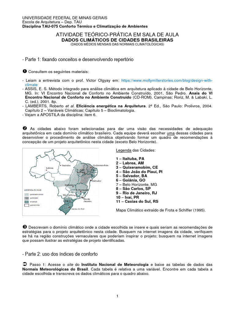 arquitetônica em cada domínio climático brasileiro. Cada equipe deverá escolher uma dessas cidades para