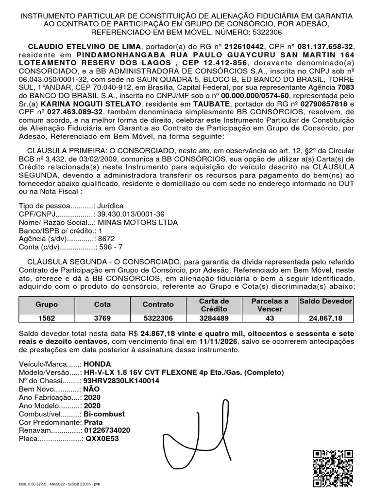 ato, oferece e dá à BB CONSÓRCIOS, em alienação fiduciária o bem a seguir identificado,