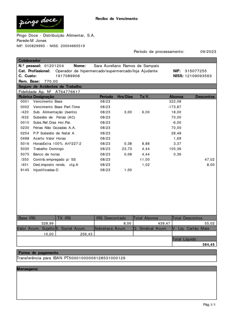 Cat. Profissional: Operador de hipermercado/supermercado/loja Ajudante NIF: 315077255