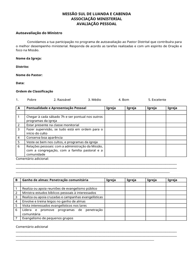 o melhor desempenho ministerial. Responda de acordo as tarefas realizadas e com um espirito de Oração e