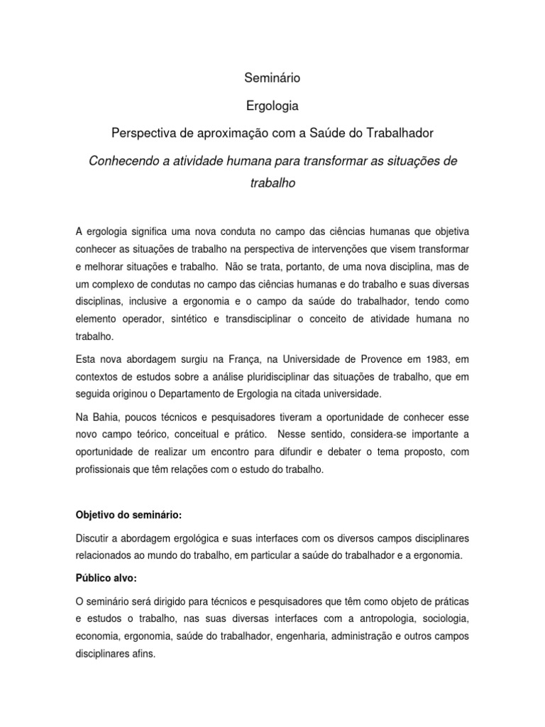 Discutir a abordagem ergológica e suas interfaces com os diversos campos disciplinares