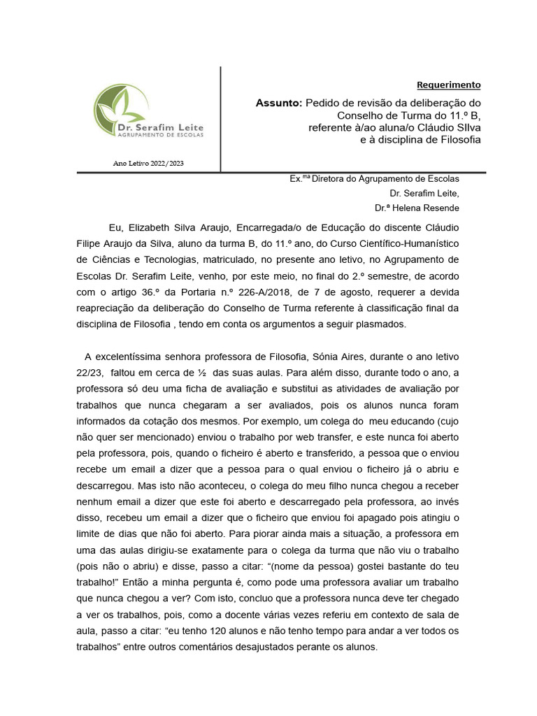 Escolas Dr. Serafim Leite, venho, por este meio, no final do 2.º semestre, de acordo