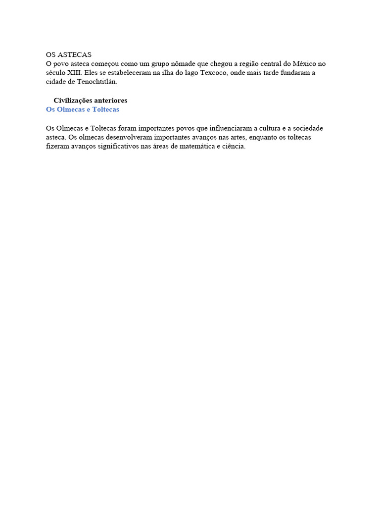 asteca. Os olmecas desenvolveram importantes avanços nas artes, enquanto os toltecas