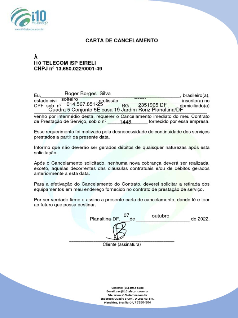 Por ser verdade firmo e assino a presente carta de cancelamento, dando fé e teor