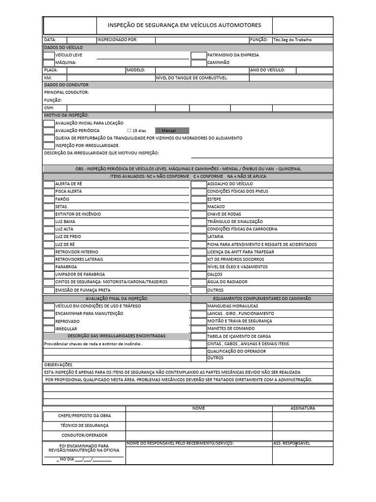 OBS.: INSPEÇÃO PERIÓDICA DE VEÍCULOS LEVES, MÁQUINAS E CAMINHÕES - MENSAL / ÔNIBUS OU VAN - QUINZENAL