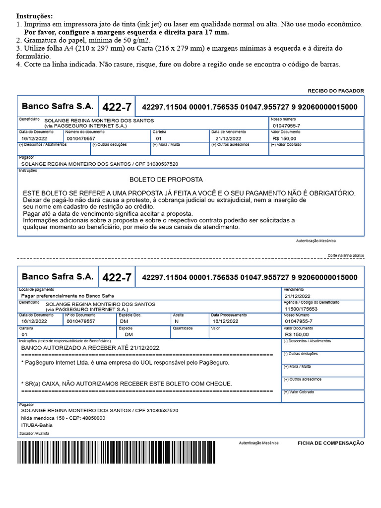 Pagar preferencialmente no Banco Safra 21/12/2022