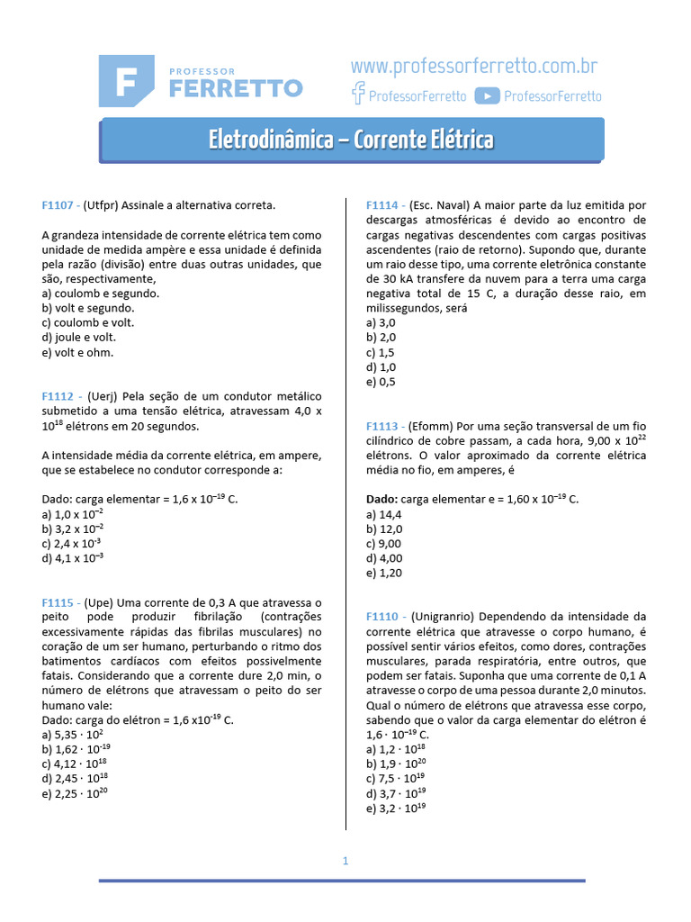 F0449 - (Fuvest) Medidas elétricas indicam que a F1108 - (Uece) Uma corrente elétrica percorre um