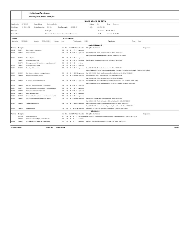 2022/2 0006873 Unidade curricular digital personalizável II OP 160 8 0 79 Aprovado Eqv) 0011150 - Psicologia jurídica e criminal, CH: 160/ha 79672-2019
