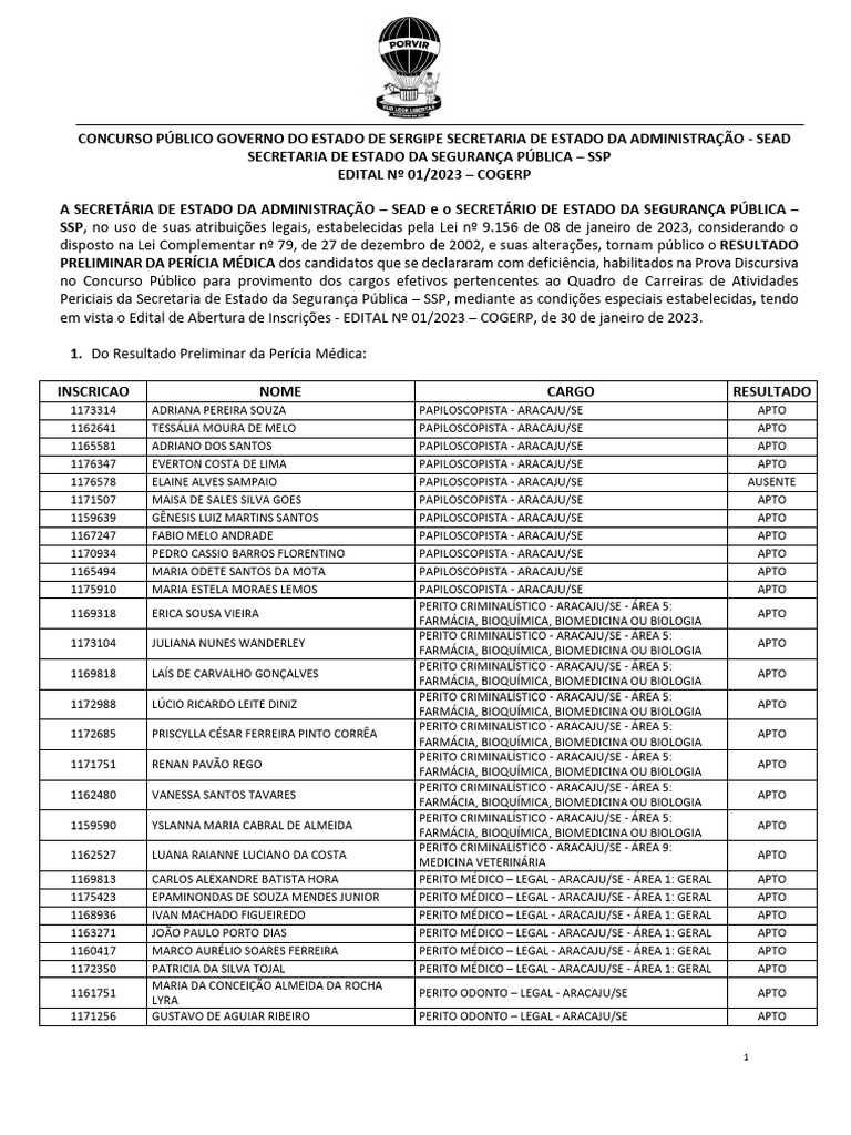 1168936 IVAN MACHADO FIGUEIREDO PERITO MÉDICO – LEGAL - ARACAJU/SE - ÁREA 1: GERAL APTO