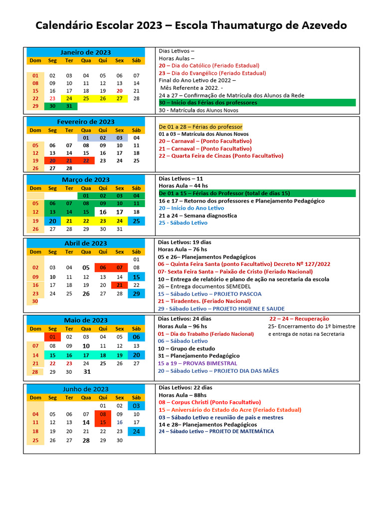 Calendário Escolar 2023 – Escola Thaumaturgo de Azevedo