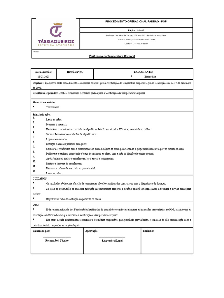 Objetivos: É objetivo deste procedimento, estabelecer critérios para a verificação da temperatura corporal segundo Resolução 499 de 17 de dezembro