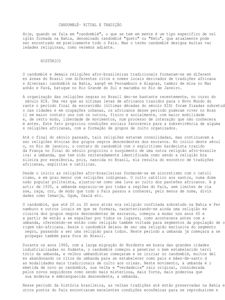 CANDOMBL- RITUAL E TRADIO Hoje, quando se fala em "candombl", o que se tem em mente um tipo especfico de rel igio formada