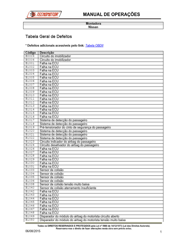 Tabela Geral de Defeitos: Montadora Nissan