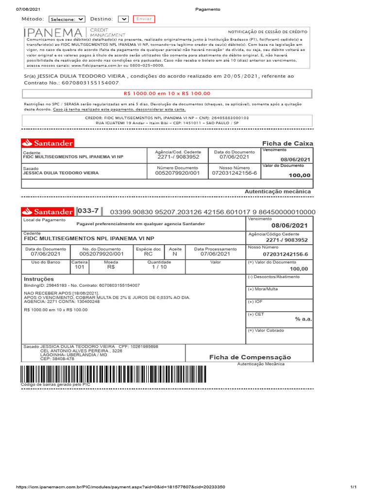 Sacado JESSICA DULIA TEODORO VIEIRA CPF: 10261985698