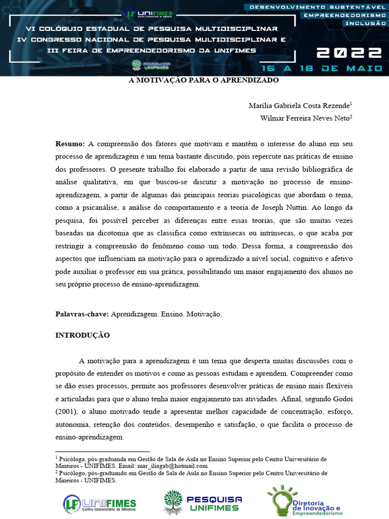 Palavras-chave: Aprendizagem. Ensino. Motivação.