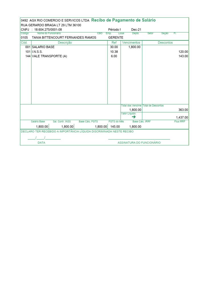 Salário Base Sal. Contr. INSS Base Cálc. FGTS FGTS do Mês Base Cálc. IRRF Fixa IRRF