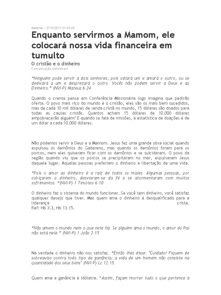 natureza terrena de vocs: imoralidade sexual, impureza, paixo, desejos maus e a ganncia, que idolatria. (NVI-P) Cl 3.5. Alguns sinais de Mamom na vida do cristo 1) Descontentamento por no ter as coisas. Conservem-se livres do amor ao dinheiro e contentem-se com o que vocs tm, porque Deus mesmo disse: "Nunca o deixarei, nunca o abandonarei". (NVI-P) Hebreus 13:5. Se voc precisa de certo carro para finalmente ficar contente, Jesus para voc no basta. Voc s se satisfar se tiver o carro e Jesus juntos e assim sucessivamente, porque seu contentamento depende de coisas, de dinheiro. Mas voc s ser uma pessoa verdadeiramente feliz quando se alegrar tendo pouco dinheiro ou muito dinheiro. Aprendi a estar contente em toda a circunstncia... 2) Preocupao e ansiedade sobre questes financeiras. "Portanto eu lhes digo: No se preocupem com sua prpria vida, quanto ao que comer ou beber; nem com seu prprio corpo, quanto ao que vestir. No a vida mais importante que a comida, e o corpo mais importante que a roupa? (NVI-P) Mateus 6:25