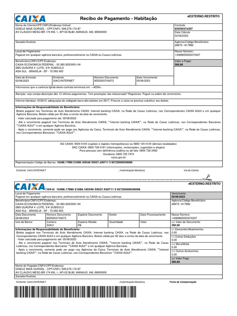 Pagável em qualquer agência bancária, preferencialmente na CAIXA ou Casas Lotéricas 05/06/2023