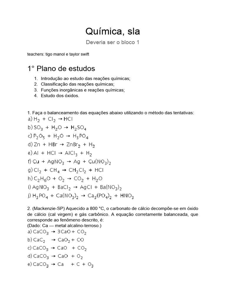 1. Faça o balanceamento das equações abaixo utilizando o método das tentativas: