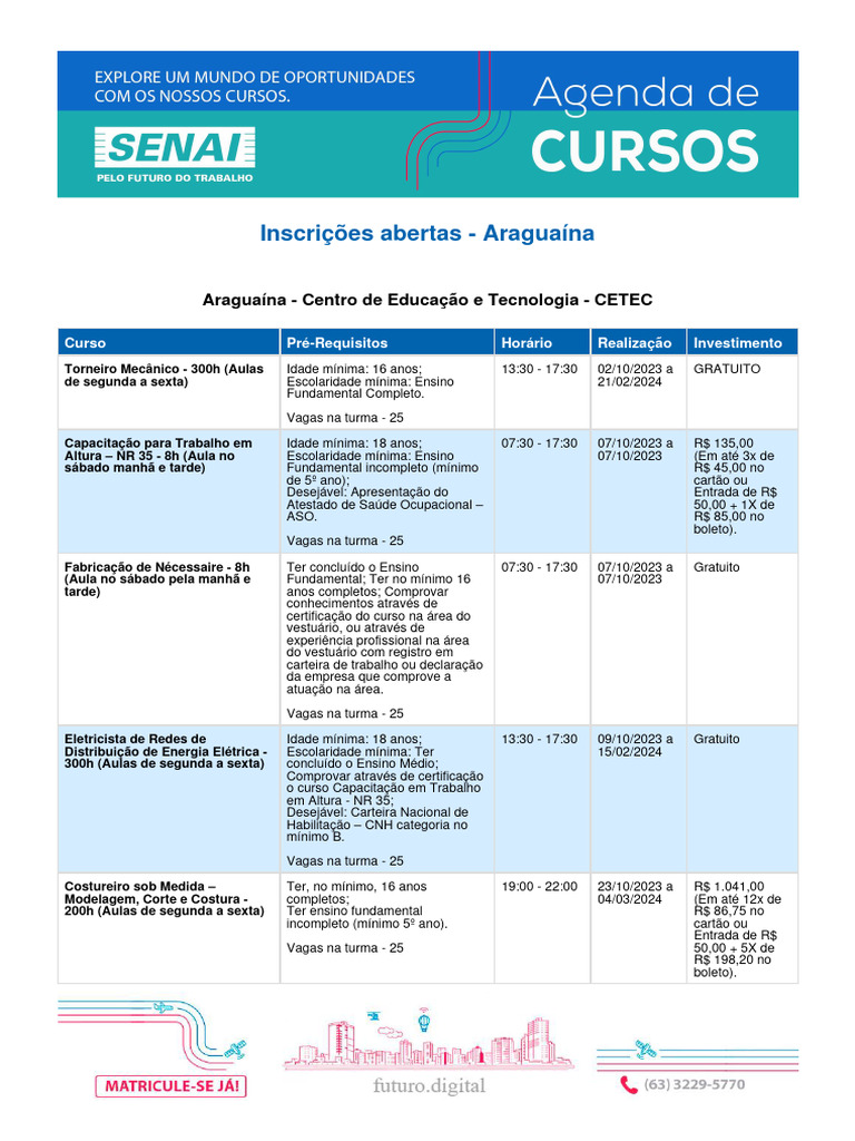 Fabricação de Nécessaire - 8h Ter concluído o Ensino 07:30 - 17:30 07/10/2023 a Gratuito
