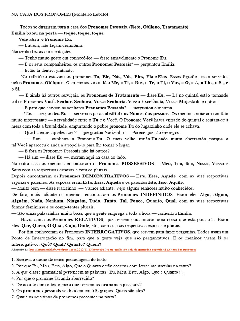 Adaptado de: https://nuhtaradahab.wordpress.com/2010/11/13/monteiro-lobato-emilia-no-pais-da-gramatica-capitulo-vi-na-casa-dos-pronomes