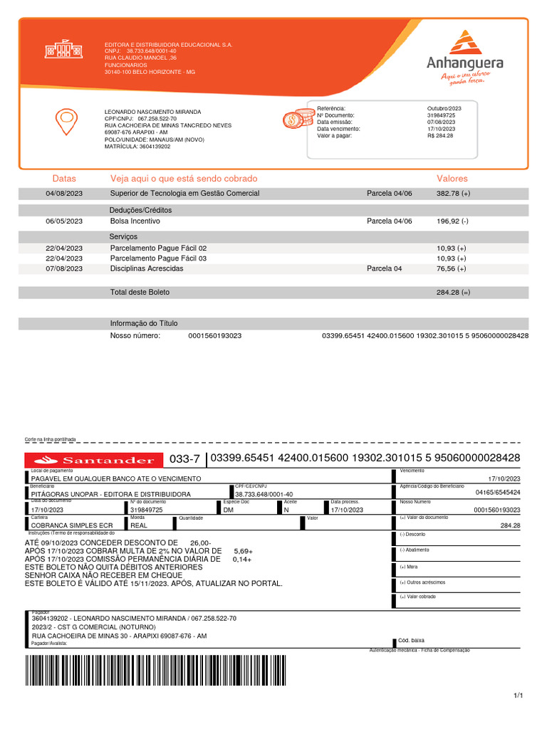 04/08/2023 Superior de Tecnologia em Gestão Comercial Parcela 04/06 382.78 (+)