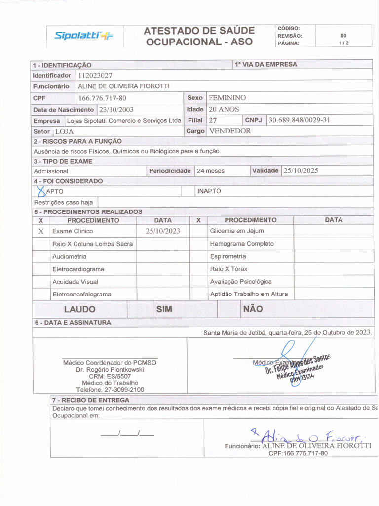 Funcionério: ALINE DE OLIVEIRA FIOROTTI