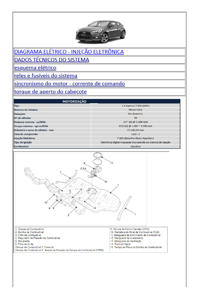 Este diagrama elétrico mostra o sistema de injeção eletrônica, incluindo o esquema elétrico, os reles e fusíveis do sistema e a sincronização do motor através da corrente de comando, bem como o torque de aperto do cabeçote.
