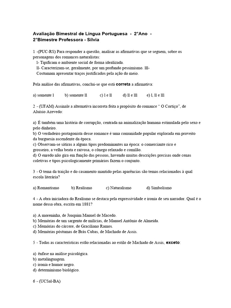 a) Romantismo b) Realismo c) Naturalismo d) Simbolismo
