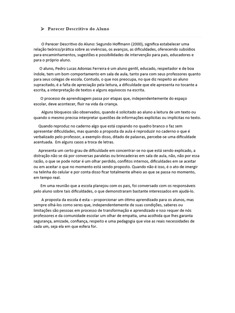 O Parecer Descritivo do Aluno: Segundo Hoffmann (2000), significa estabelecer uma