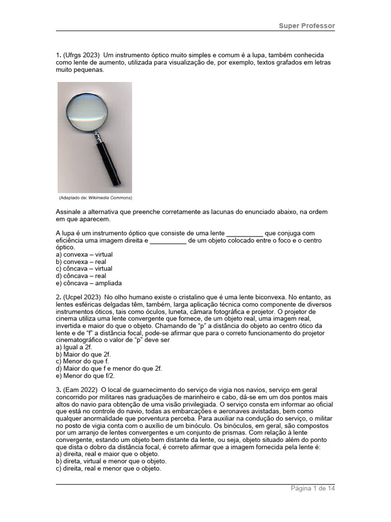 1. (Ufrgs 2023) Um instrumento óptico muito simples e comum é a lupa, também conhecida