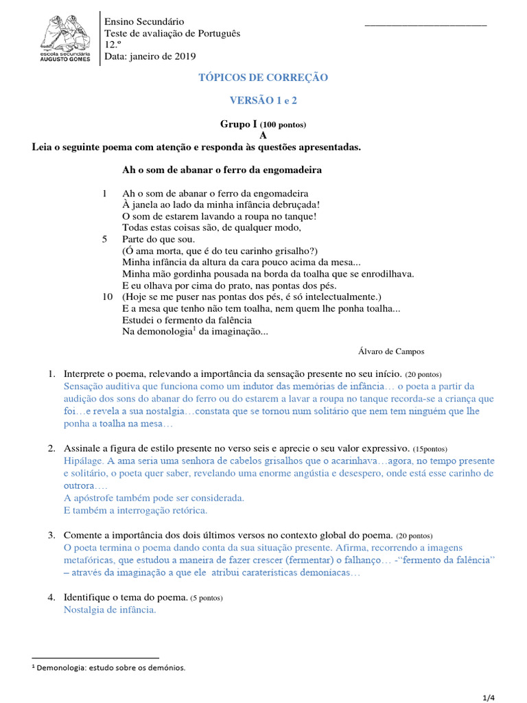1. Interprete o poema, relevando a importância da sensação presente no seu início. (20 pontos)