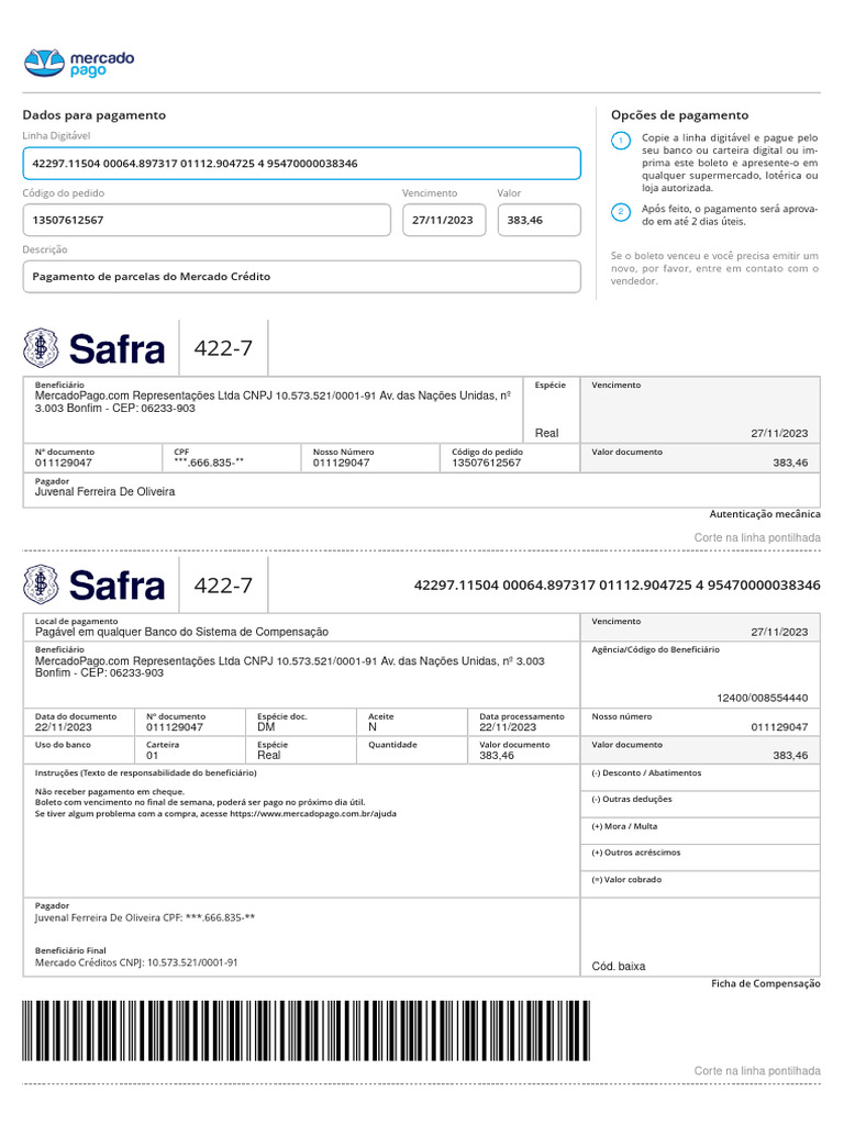 Pagamento de parcelas do Mercado Crédito vendedor.