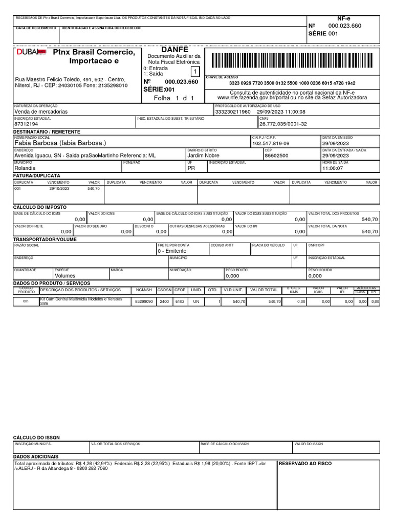 Ptnx Brasil Comercio, DANFE
