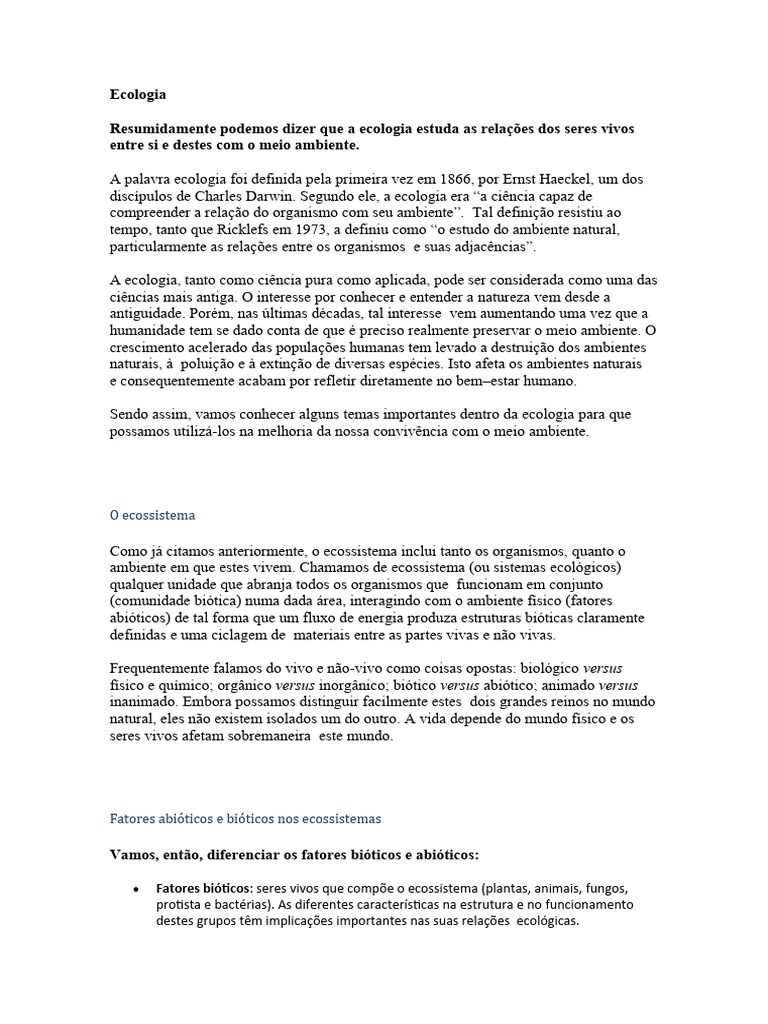 Resumidamente podemos dizer que a ecologia estuda as relações dos seres vivos