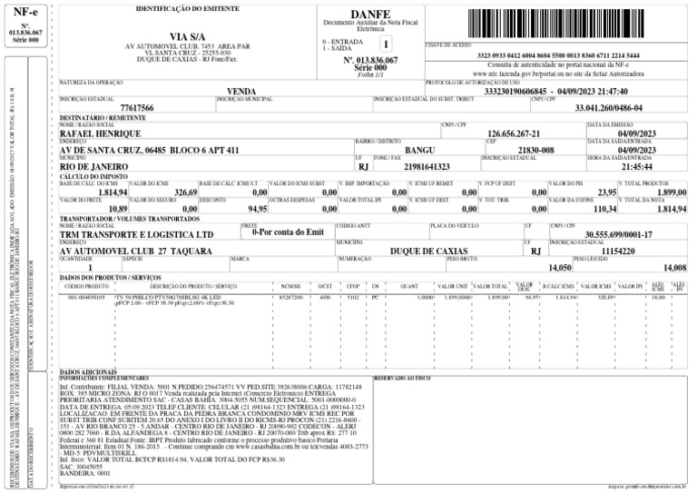 RECEBEMOS DE VIA S/A OS PRODUTOS E/OU SERVIÇOS CONSTANTES DA NOTA FISCAL ELETRÔNICA INDICADA AO LADO. EMISSÃO: 04/09/2023 VALOR TOTAL: R$ 1.814,94