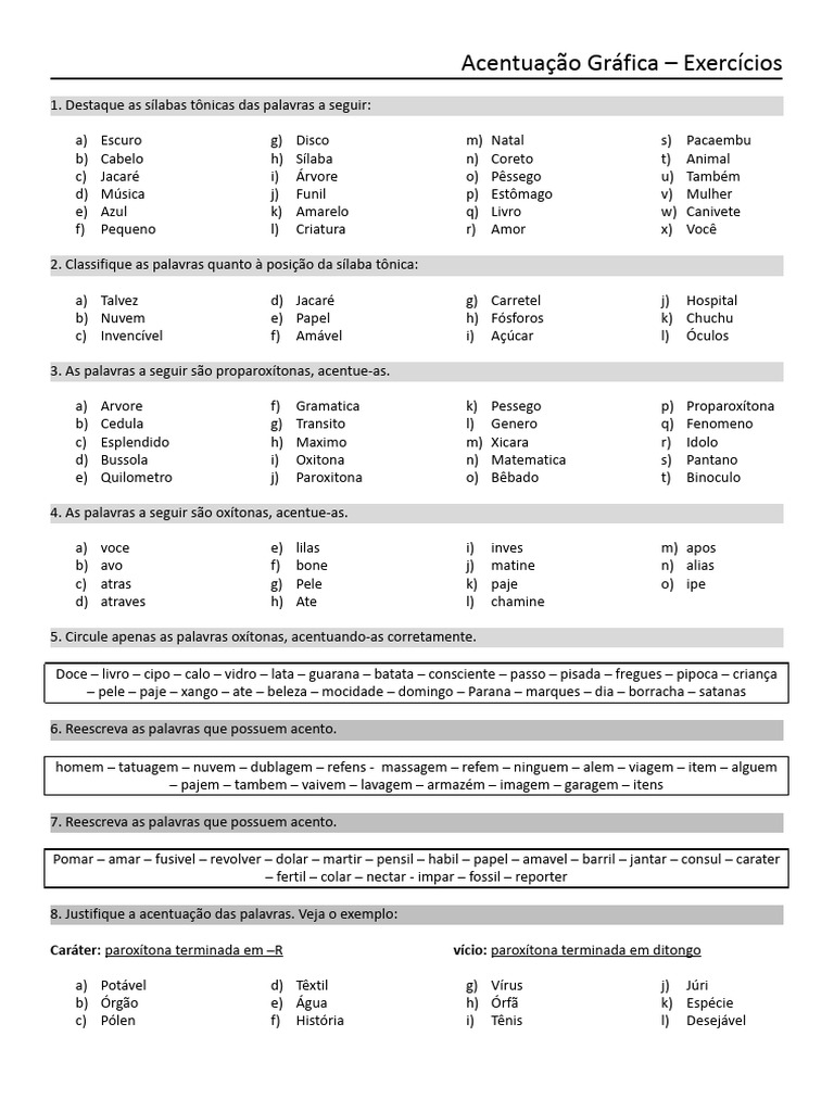 1. Destaque as sílabas tônicas das palavras a seguir: