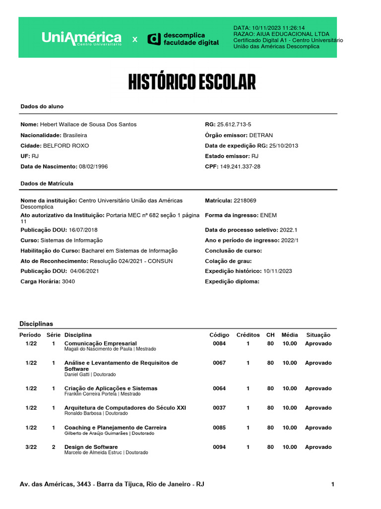 3/22 2 Design de Software 0094 1 80 10.00 Aprovado