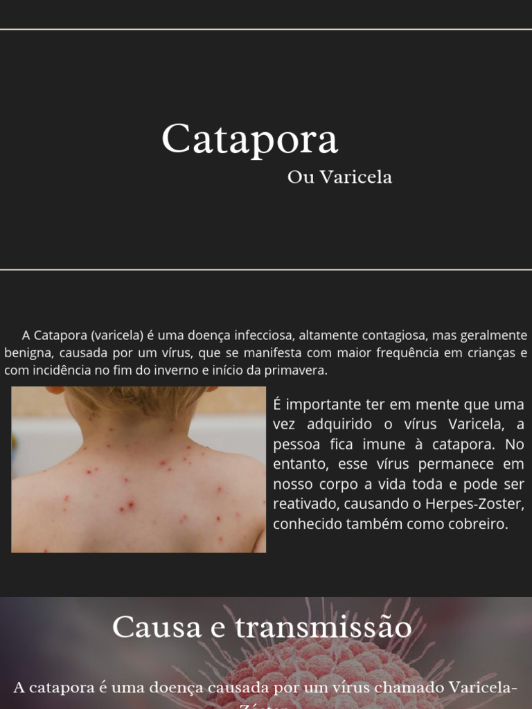 A Catapora (varicela) é uma doença infecciosa, altamente contagiosa, mas geralmente