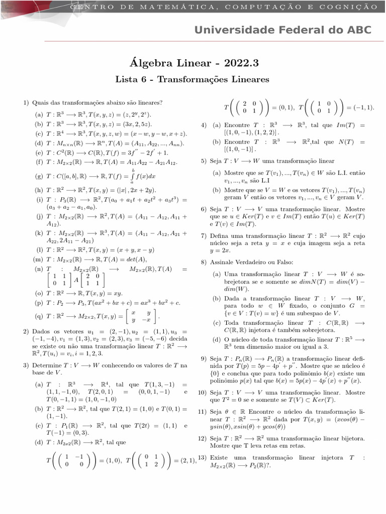 (m) T : M2×2 (R) −→ R, T (A) = det(A), 8) Assinale Verdadeiro ou Falso: