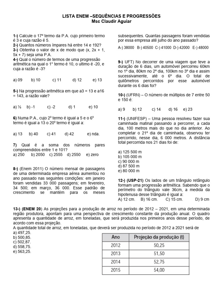 LISTA ENEM –SEQUÊNCIAS E PROGRESSÕES