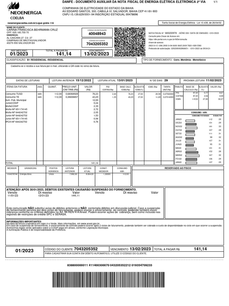 CÓDIGO DO CLIENTE 7043205352 VENCIMENTO 13/02/2023 TOTAL A PAGAR R$ 141,14