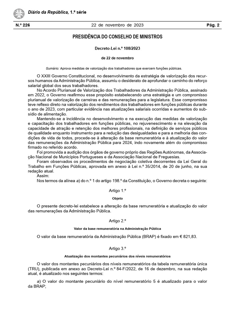 O presente decreto-lei estabelece a alteração da base remuneratória e atualização do valor