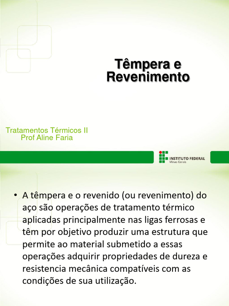 • A têmpera e o revenido (ou revenimento) do