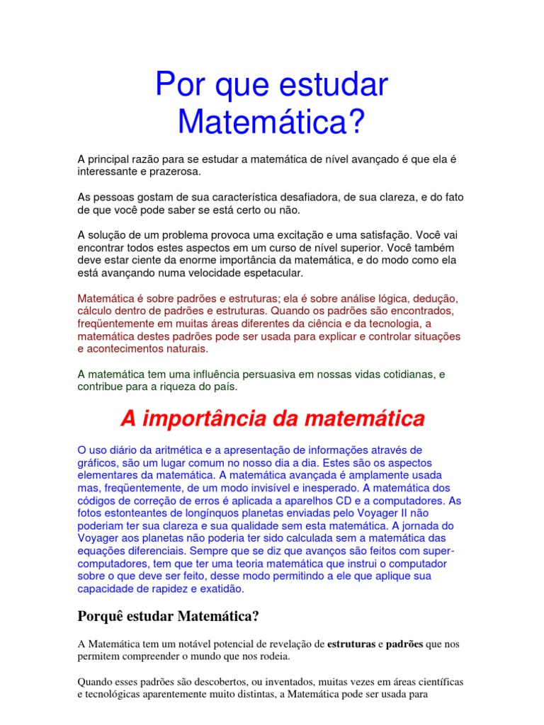 A principal razo para se estudar a matemtica de nvel avanado que ela interessante e prazerosa. As pessoas gostam de sua caracterstica desafiadora, de sua clareza, e do fato de que voc pode saber se est certo ou no. A soluo de um problema provoca uma excitao e uma satisfao. Voc vai encontrar todos estes aspectos em um curso de nvel superior. Voc tambm deve estar ciente da enorme importncia da matemtica, e do modo como ela est avanando numa velocidade espetacular. Matemtica sobre padres e estruturas; ela sobre anlise lgica, deduo, clculo dentro de padres e estruturas. Quando os padres so encontrados, freqentemente em muitas reas diferentes da cincia e da tecnologia, a matemtica destes padres pode ser usada para explicar e controlar situaes e acontecimentos naturais. A matemtica tem uma influncia persuasiva em nossas vidas cotidianas, e contribue para a riqueza do pas.