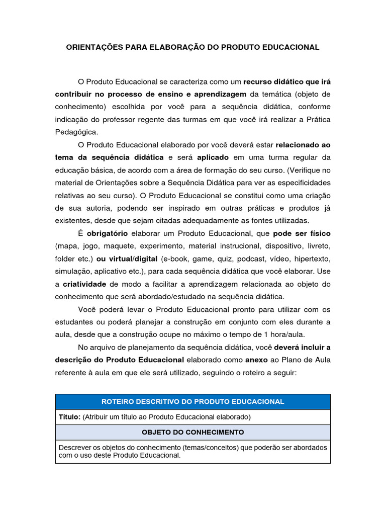 relativas ao seu curso). O Produto Educacional se constitui como uma criação