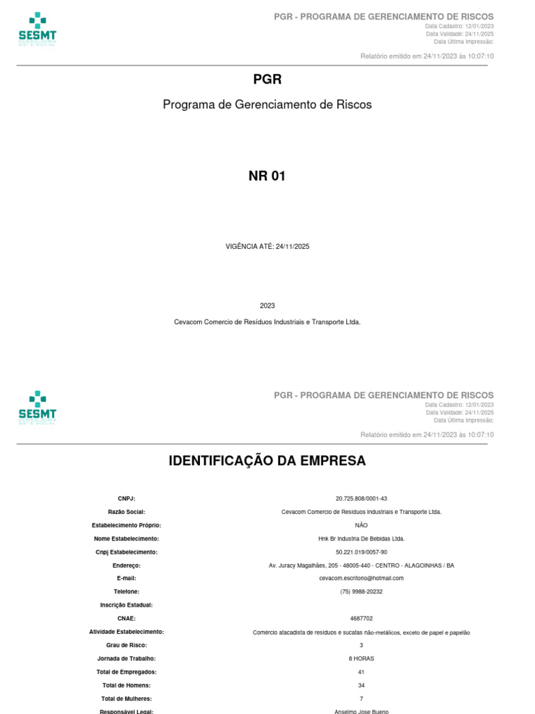 Este documento representa a implementação do PGR - Programa de Gerenciamento de Riscos, estabelecido pela NR-1 (Portaria SEPRT n.º 6.730):