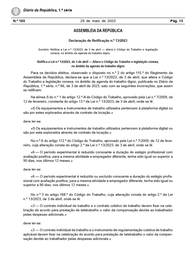 Sumário: Retifica a Lei n.º 13/2023, de 3 de abril — altera o Código do Trabalho e legislação