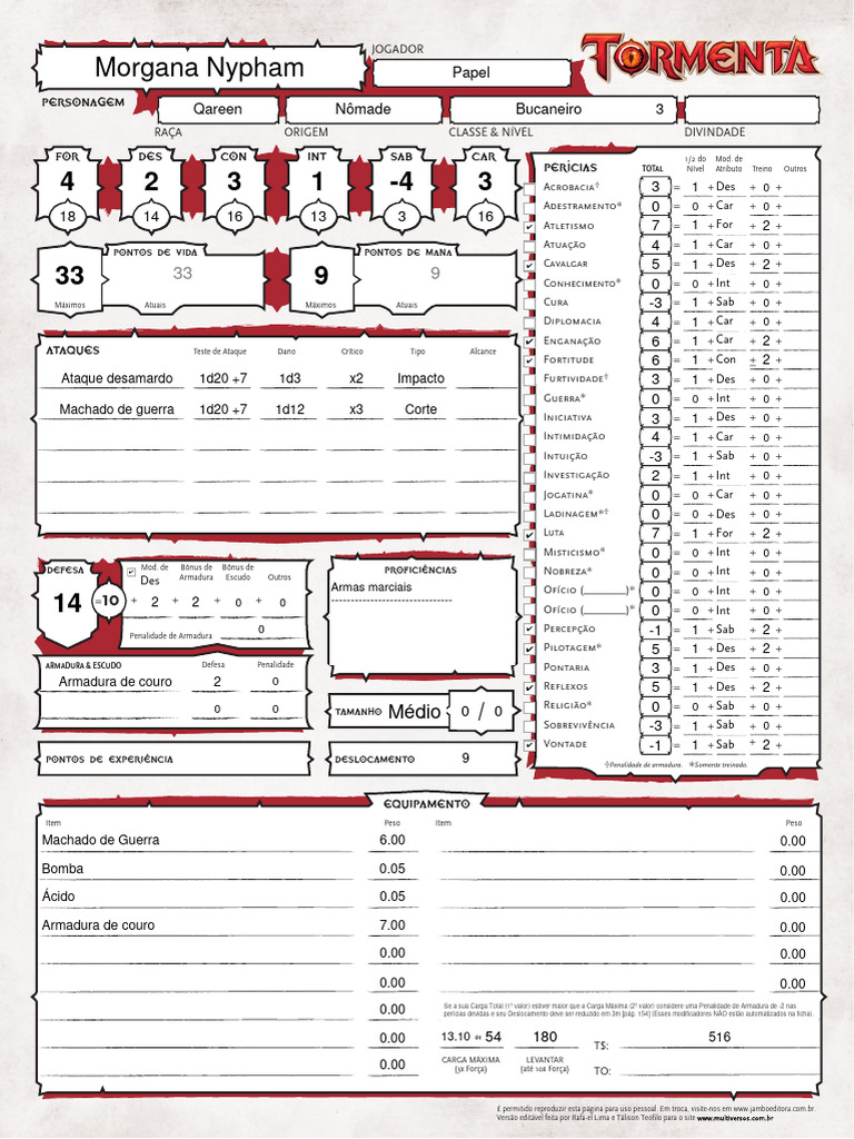 0.00 perícias devidas e seu Deslocamento deve ser reduzido em 3m [pág. 154] (Esses modificadores NÃO estão automatizados na ficha).
