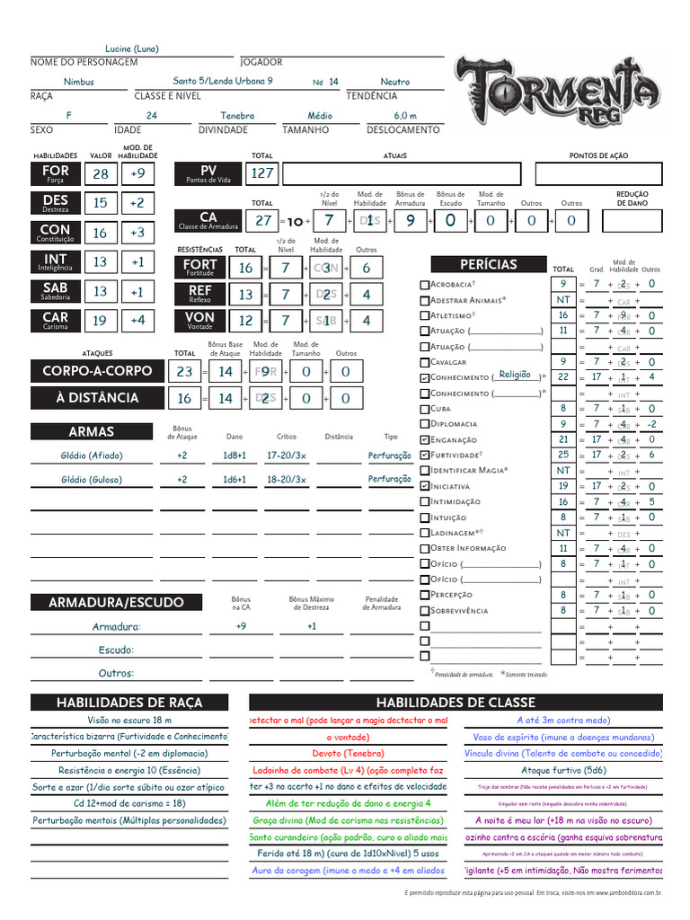 Sorte e azar (1/dia sorte súbita ou azar atípico ter +3 no acerto +1 no dano e efeitos de velocidade Traje das sombras (Não recebe penalidades em Perícias e +2 em furtividade)